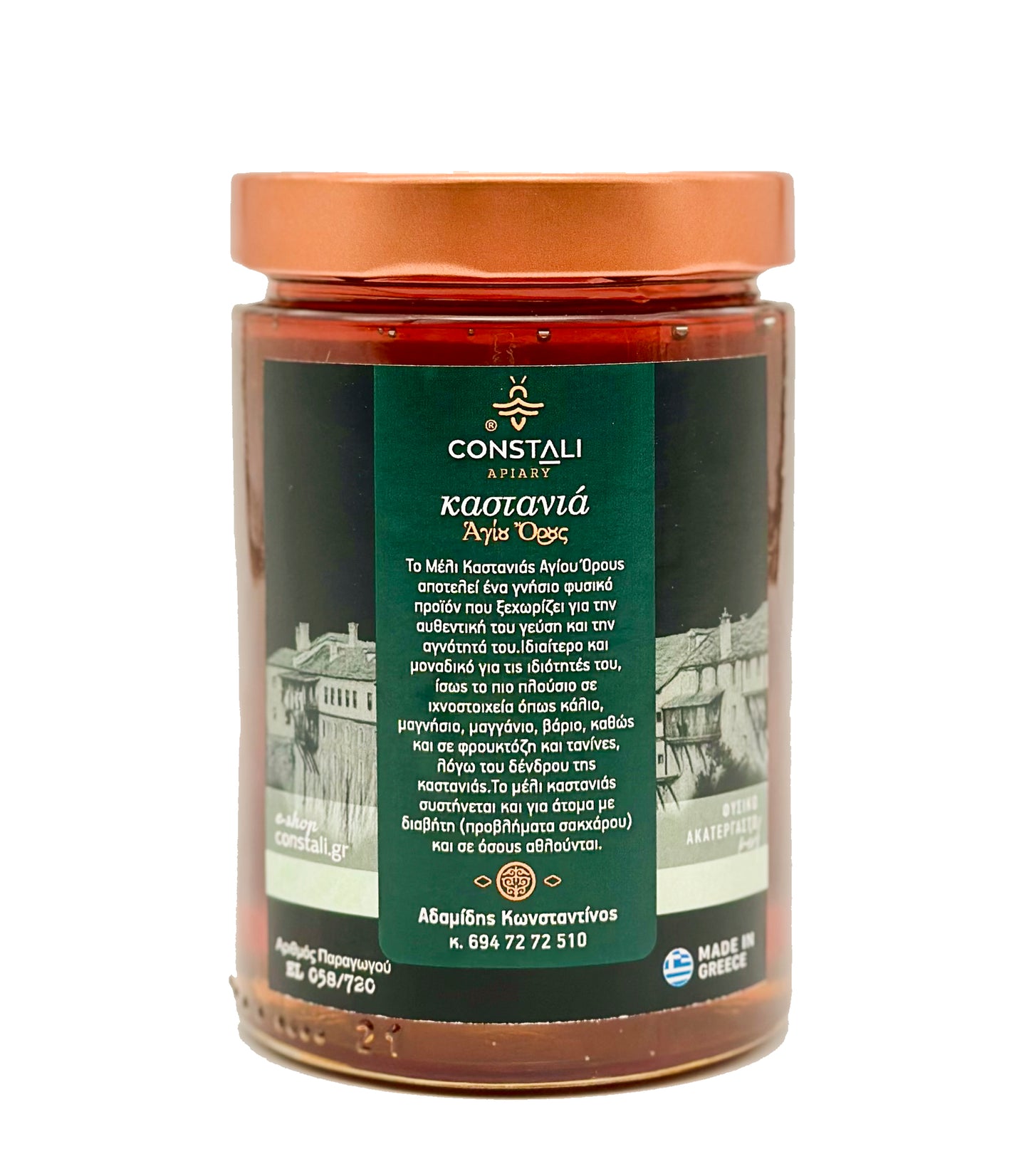 Το μέλι καστανιάς Constali παράγεται από την μοναδική ποικιλία καστανιάς στην χερσόνησο του Αγίου Όρους από το νέκταρ και τις μελιτώδεις εκκρίσεις των δέντρων καστανιάς.